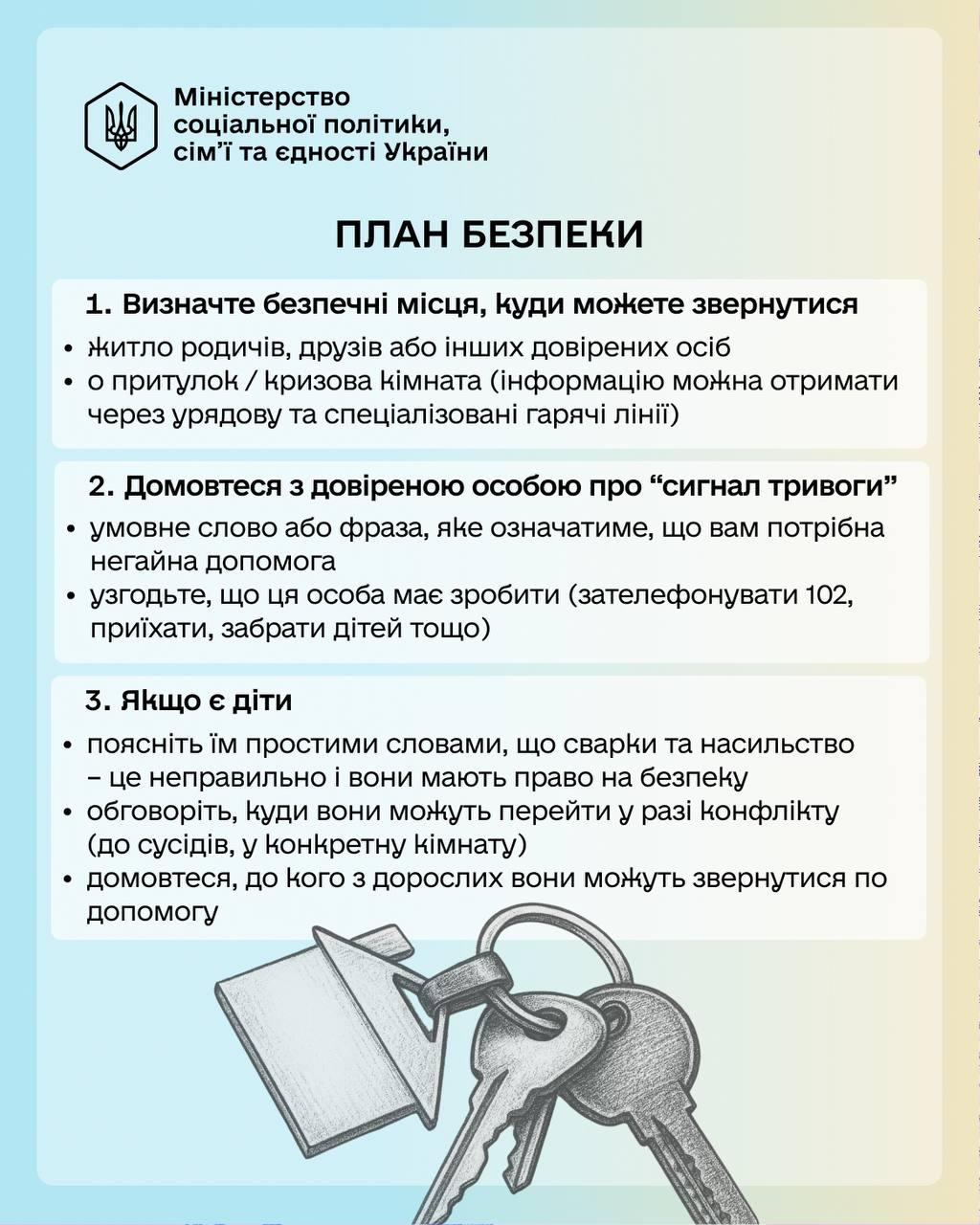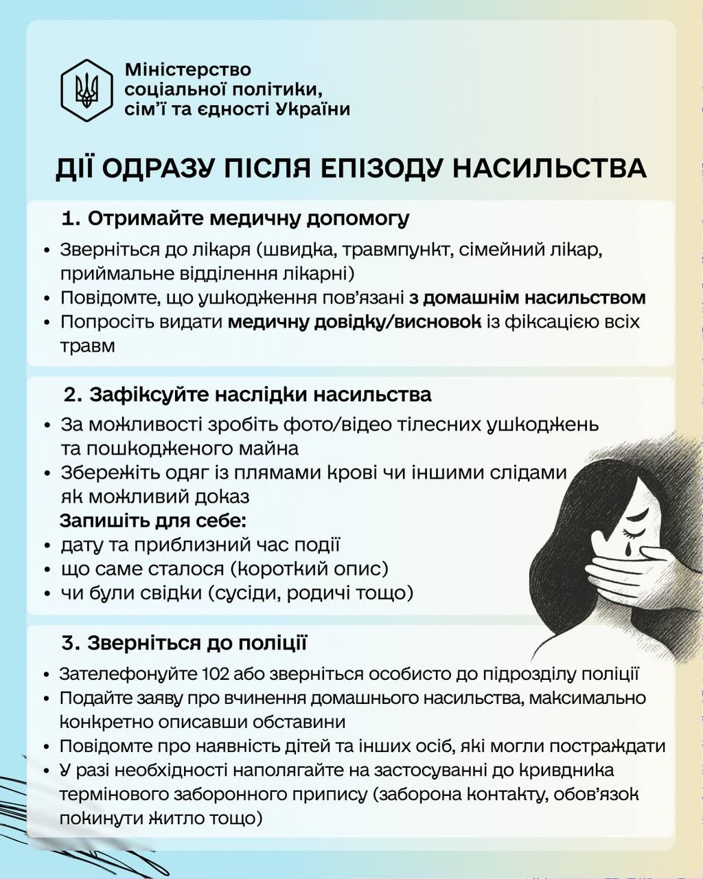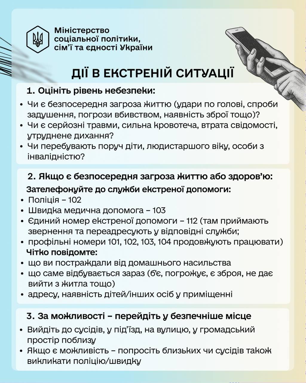 До Міжнародного дня боротьби за ліквідацію насильства над жінками Міністерство соціальної політики сім'ї та єдності України підготували покроковий чек-лист — що робити в екстреній ситуації, які документи мати під рукою, як скласти план безпеки та куди звертатися по допомогу.