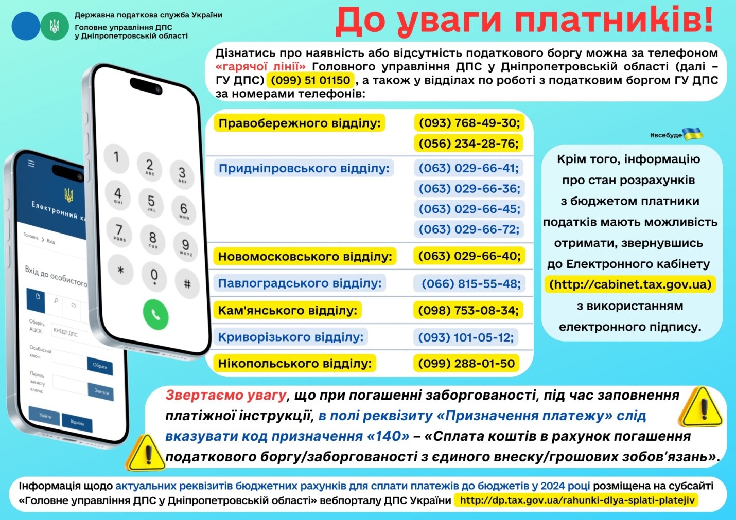 Інформація щодо актуальних реквізитів бюджетних рахунків для сплати платежів до бюджетів у 2024 році розміщена на субсайті «Головне управління ДПС у Дніпропетровській області» вебпорталу ДПС України http://dp.tax.gov.ua/rahunki-dlya-splati-platejiv.