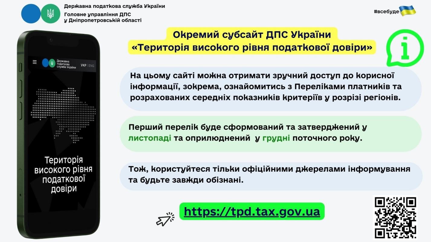 Для зручності платників Державною податковою службою створено окремий субсайт «Територія високого рівня податкової довіри», який розміщено за посиланням https://tpd.tax.gov.ua.